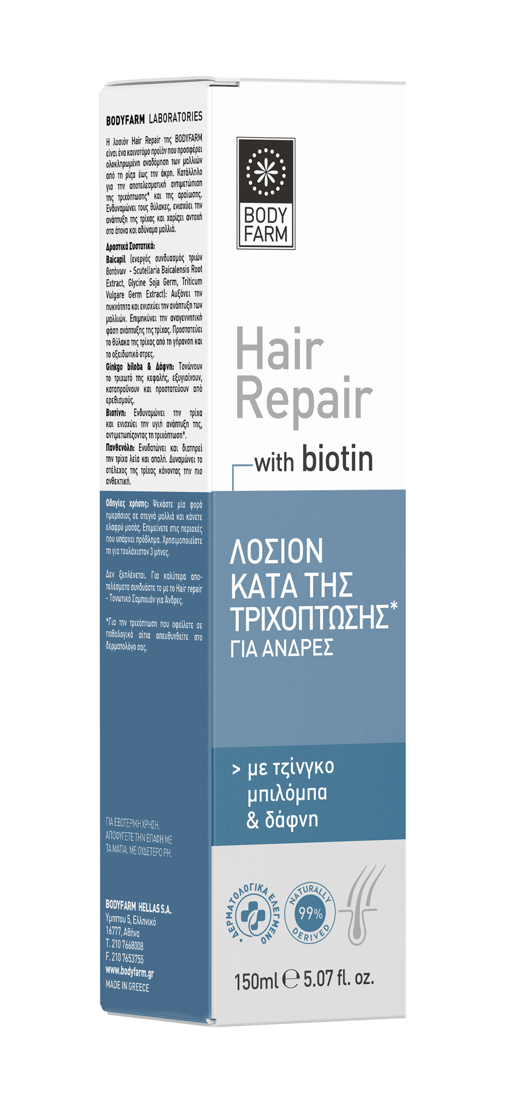 Bodyfarm Hair Repair lotion is a revolutionary product that fully rejuvenates hair from root to end. Ideal for effective treatment of hair loss* and hair thinning. It enhances hair follicles, boosts hair growth and strengthens limp and weak hair.